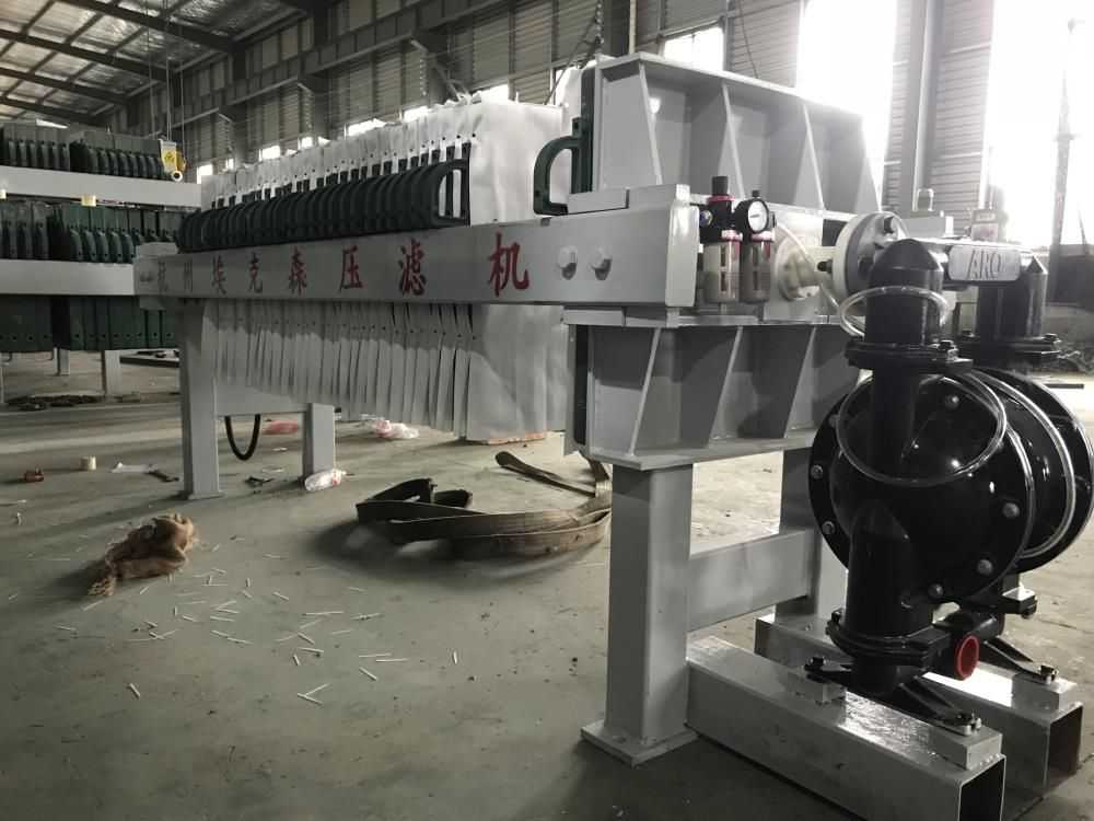 隔膜壓榨壓濾機(jī)是由隔膜板和廂式濾板排列組成濾室,在輸料泵的壓力作用下將料漿輸入濾室,通過(guò)過(guò)濾介質(zhì)(濾布)將料漿中的固體和液體分離,當(dāng)料漿中的固體形成餅后,再向隔膜通入空氣,對(duì)濾室內(nèi)的固體充分壓榨。